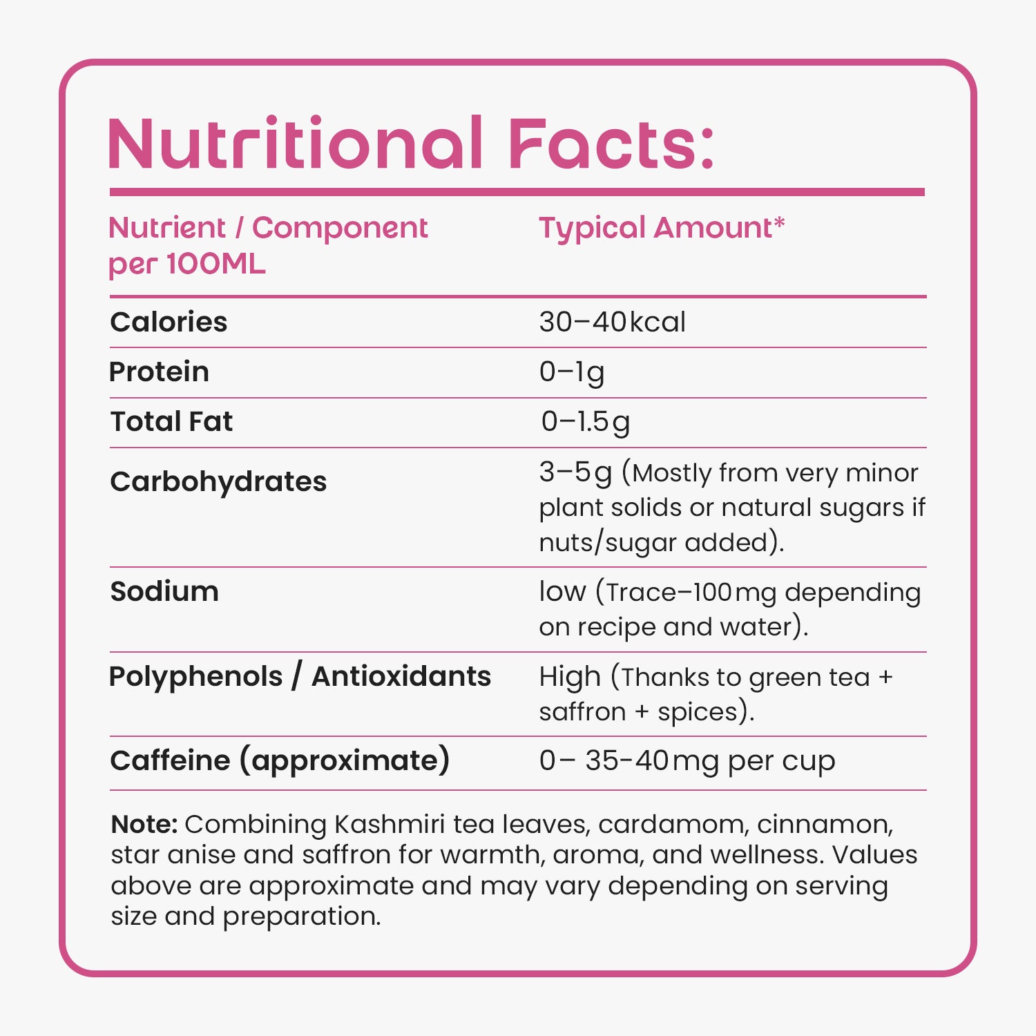 Indulge in the authentic taste of Kashmiri Chai(Kehwa), a luxurious blend of Kashmiri tea leaves, saffron, and aromatic spices. Renowned for its vibrant pink hue and health benefits, this traditional tea offers a delightful mix of flavor and wellness.